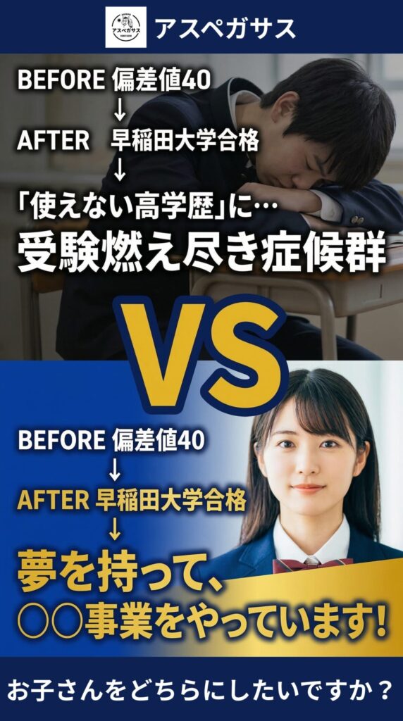Before:D判定から塾や親に管理され、猛勉強して合格。「管理されること」に慣れすぎ、自分の意志で旗を立てる「情熱」が欠けていた。