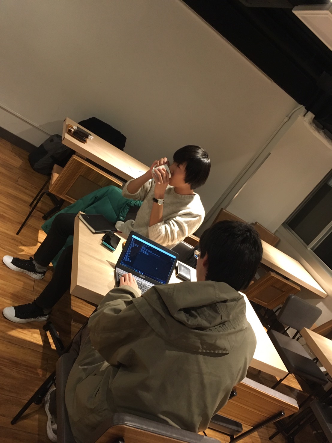 コーヒーを飲みながらの活動もいいですねぇ。