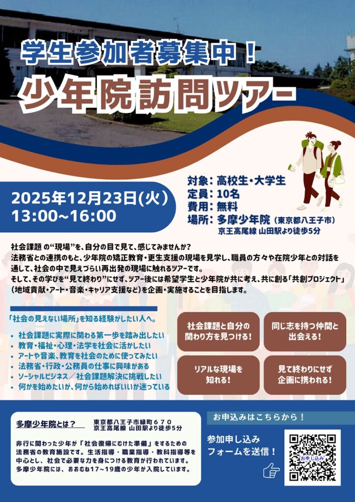本ツアーは、高校生・大学生を対象に、社会課題の“現場”を実際に訪れ、矯正教育や更生支援について学ぶことを目的とした取り組みです。